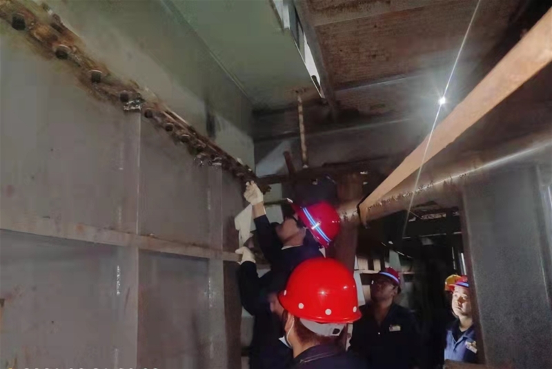 在檢修現場,劉安民了解了檢修計劃、工程進度等情況,詢問了檢修進展、存在困難及重點環節等,并詳細了解了450平方米燒結機成品區域環冷機檢修質量和進度,詢問了外協單位資質、施工工藝和工期情況,重點了解了450平方米燒結機混料區域鋼托輥和鋼絲繩更換項目、臺車區域陶瓷襯板和風箱消缺項目、送料器安裝項目、點火機試機校正項目、布料帶軌道安裝項目等。同時叮囑現場職工及外協人員要穿戴好勞護用品,在確保安全的前提下,保證施工進度和質量。