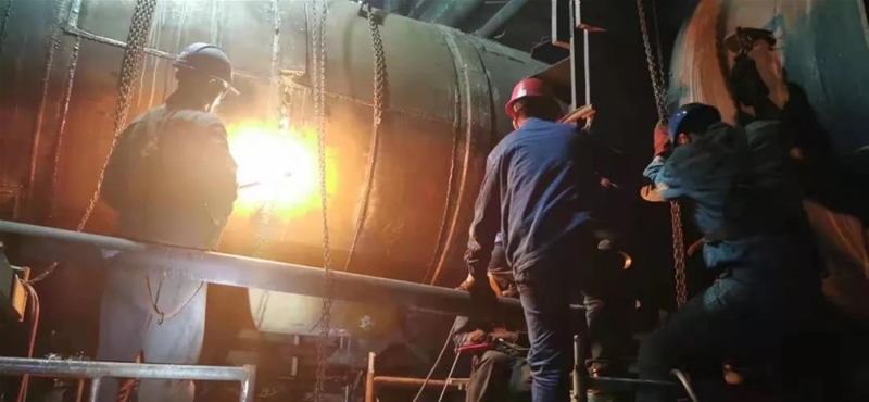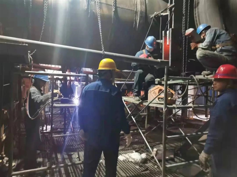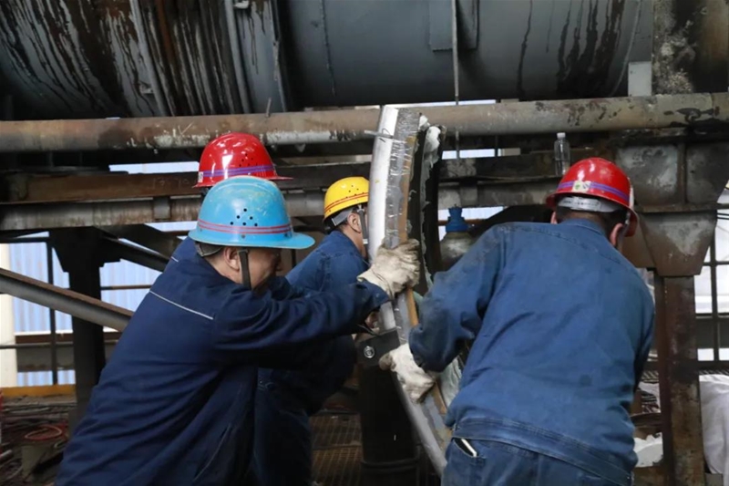 “來,再來兩個人,抬一下膨脹節……”有人艱難地拉動備件,有人趕來幫忙,嘴里還喊著人員支援。話音未落,不遠處外協工隊的工人們都跑了過來,齊心協力把膨脹節搬抬至指定位置。“小劉,廢舊的保溫磚一定要清理干凈!”“王師,管道焊接一定要高質量!”“收到,一定保障新保溫磚鋪好……”