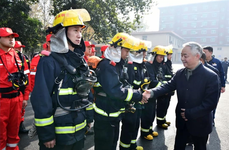 楊海峰在慰問中與龍鋼公司煤氣救護隊和消防隊隊員一一握手,并現場觀摩了消防隊消防車現場實操演示、煤氣救護隊空氣呼吸器操作和應急隊員心肺復蘇模擬演示。