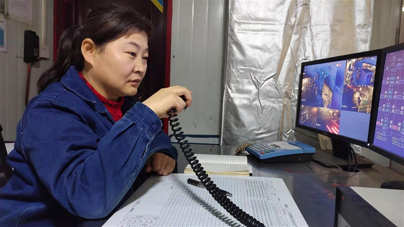 推鋼室內(nèi),推鋼工雷蕾在認(rèn)真操作著,另一名推鋼工邱潔在書寫推鋼記錄。因?yàn)槭峭膺\(yùn)鑄坯,推鋼室不斷有司機(jī)進(jìn)出開票,她們毫無怨言,熱情接待。