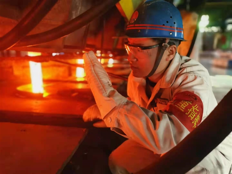走進澆鋼區,一股熱浪迅速將人包裹起來。八個鋼流在火紅的套管中穿過,平穩有序。一名中包工手里握著小鏟子,徘徊在八個流之間,仔細觀察著每個流次的澆注情況,時不時地將保護渣加入結晶器內;另一名中包工拿著工具半蹲在七流前,準備將到期的中包套管卸下。“快、快、快”,一名穿著防護服的中包工提著烤得發紅的中包套管快速向七流奔去。就在這時,舊套管快速卸下,新套管立即戴上,瞬間鋼花四濺、璀璨奪目。自實施全保護澆注以來,他們嚴格按照中包套管使用時間進行更換,防止鋼水在澆注過程中氧化,保證鑄坯質量100分。