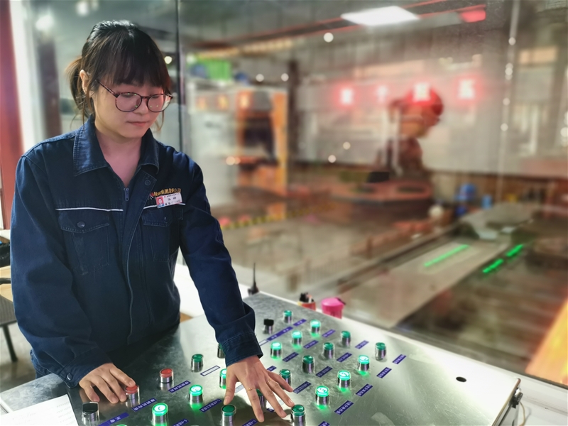 操作室內,推鋼工焦娜站在操作臺前,一會抬頭看顯示器,一會俯視臺下輥道,指尖在布滿各色按鈕的操作臺上“跳舞”,她認真的樣子,是一道獨特的風景,宛若一縷春風,溫暖而淡然。推鋼工作看似簡單,實則不然。連鑄新區承擔著連鑄生產的重要任務,對她們來說八機八流生產是不小的考驗,是對眼力、手力、耐力、心理的考驗,操作臺上各色的按鈕、各種票據、記錄,她們一樣都不馬虎,雖然工作難度大,但這群娘子軍們用她們的細心,完美勝任了這項極具挑戰的工作。