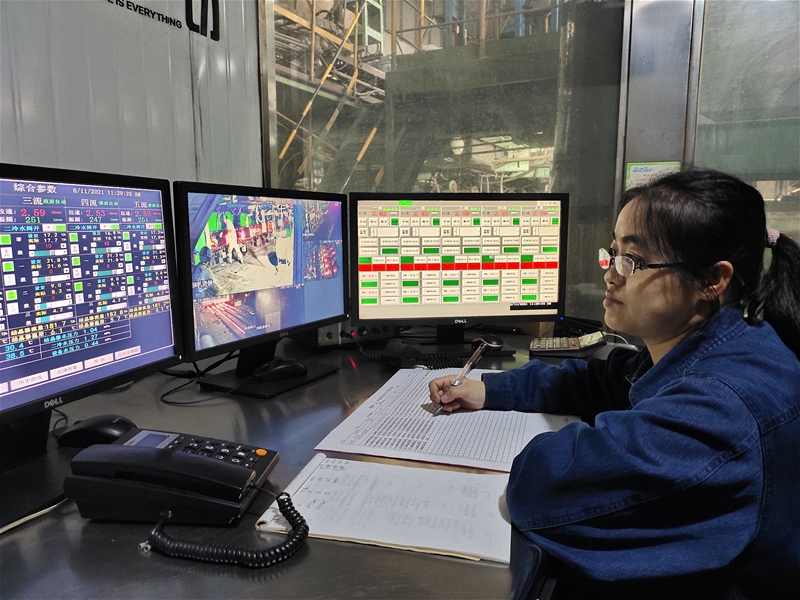 主控工陳小育一只手拿著訊響器播報(bào)中包溫度,另一只手正在認(rèn)真書寫中包溫度。五分鐘一次的播報(bào)溫度,十分鐘一次的記錄書寫,她就這樣一直忙碌著。推鋼工吉銳琴站在操作臺(tái)前,一會(huì)兒抬頭看看顯示器,一會(huì)兒看看臺(tái)下運(yùn)行的鑄坯,手指在按鈕上不停地“舞蹈”。看起來,似乎主控工和推鋼工的工作都很輕松、簡單。實(shí)則不然,這完全考驗(yàn)她們的反應(yīng)速度、眼力、手力、心理承受能力等。她們堅(jiān)持將簡單的事情重復(fù)做,重復(fù)的事情用心做,無怨無悔,用瘦弱的身體挑起了生產(chǎn)的重?fù)?dān),用實(shí)際行動(dòng)詮釋著巾幗擔(dān)當(dāng)。