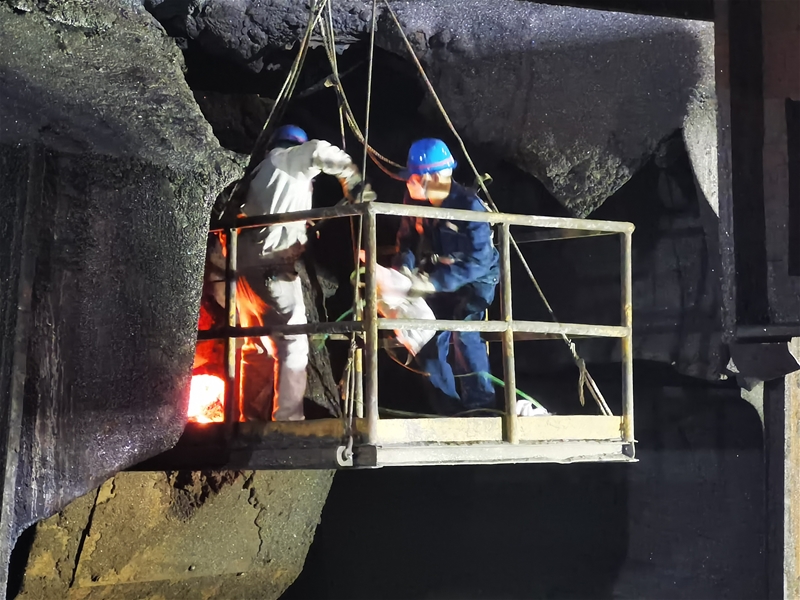 此次檢修時間緊、任務重,為了高質量完成檢修任務,該單位黨員干部瞄準目標、通力協作,“釘”在檢修現場。恰逢高溫時節,檢修現場酷熱異常,從爐口散發出來的熱浪令人望而生畏。而所有參與檢修的斗士們毫不畏懼,他們身著白色阻燃服、腳踩專用耐高溫鞋,全副武裝,冒著炙烤進行“清爐襯”作業。由于爐內空間狹窄,加之溫度高,清爐襯過程異常艱難。他們分為兩組,輪換作業,保證進度絲毫不減。汗水浸濕了工服,汗珠往下滴個不停,而檢修隊員毫不理會,他們拼著勁往前沖……在他們的全力拼搏下,原本計劃一天拆完爐襯,他們只用了半天就完成了,這就是煉鋼速度。