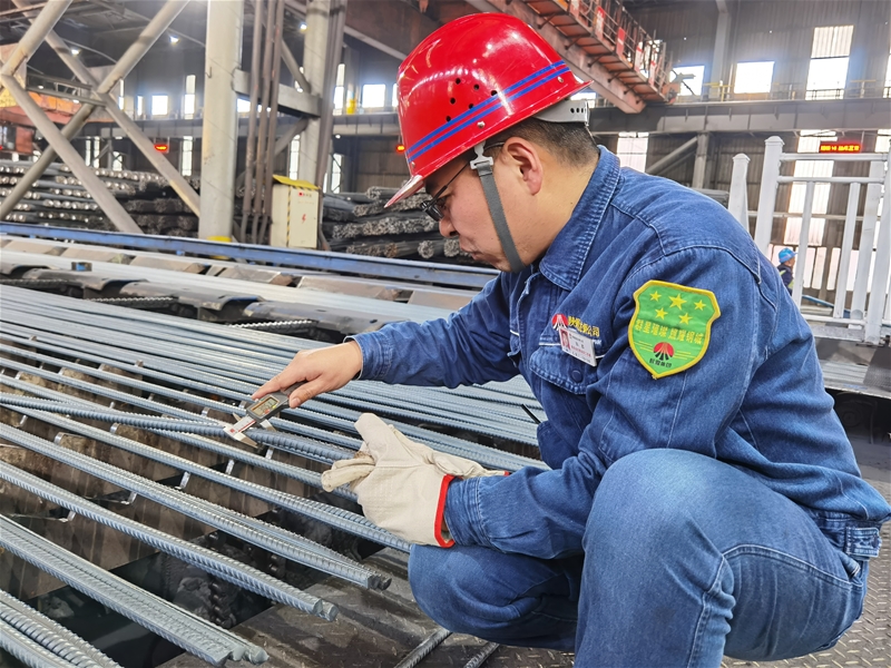 在周圍環(huán)境溫度達(dá)40℃的棒材三線,一股熱浪襲來(lái),作業(yè)長(zhǎng)張?chǎng)晤櫜簧现丝荆每ǔ邷y(cè)量棒材幾何尺寸,以實(shí)際行動(dòng)踐行“人人做精英,根根求精品”的“精”文化,確保生產(chǎn)出來(lái)的每一根鋼材都是精品。