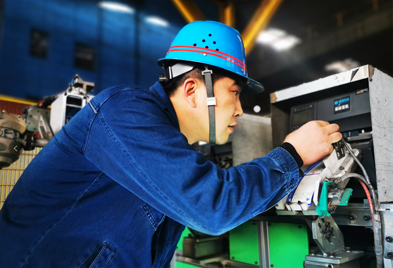 在棒材一線,質(zhì)檢工王志剛正在認(rèn)真排查標(biāo)牌機(jī)器人線路故障,確認(rèn)故障排除后,準(zhǔn)備啟動(dòng)機(jī)器,開始新一輪的標(biāo)牌打印工作,為生產(chǎn)順行保駕護(hù)航。