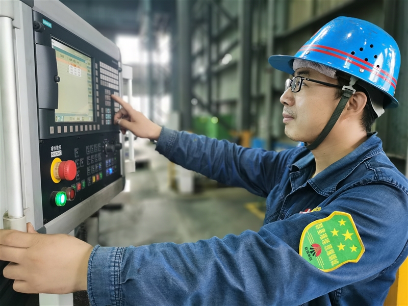 悶熱的廠房,機(jī)加班長(zhǎng)陳永林正在輸入軋輥車削程序,為軋輥加工工作打好基礎(chǔ)。