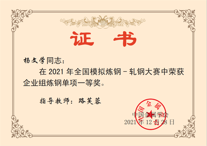 近日,從中國金屬學會傳來喜訊,公司煉鋼廠轉二作業區技術主管楊文學、煉鋼廠3#轉爐煉鋼工趙方、煉鋼廠5#轉爐煉鋼工李嘉文3名同志在2021年全國模擬煉鋼-軋鋼大賽中均榮獲企業組煉鋼單項一等獎。
