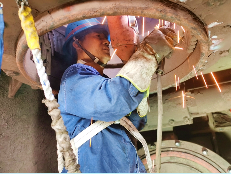 在現(xiàn)場,鉗工劉建軍綁好安全帶,快速進(jìn)入到不足四平方米的閥箱開始受限空間作業(yè)。他認(rèn)真查看著料斗的每一處刷槽現(xiàn)象,接過精細(xì)制作的10公分六棱鋼,一點(diǎn)一點(diǎn)將六棱鋼卡槽焊接牢固。一根、兩根、三根……伴隨著六棱鋼越來越多,劉建軍頭上的汗水不斷涌出,流進(jìn)眼睛里。只見他用袖口簡單抹了一把汗,又接著檢查沖刷口……一干就是20多分鐘。