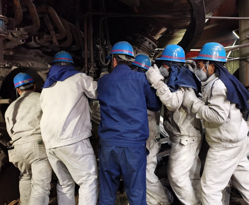12日早晨9點(diǎn)鐘,高爐風(fēng)口平臺上,溫度滾燙,但這絲毫不能阻擋參檢爐前工們奮進(jìn)的步伐。他們身著白色阻燃服,在熱浪拂面的14#風(fēng)口旁兩兩一組,精誠團(tuán)結(jié)、合力攻堅,一人雙手緊握鋼釬,一人使出全身力氣揮舞鐵錘,正全神貫注清理風(fēng)口套里面的殘渣……