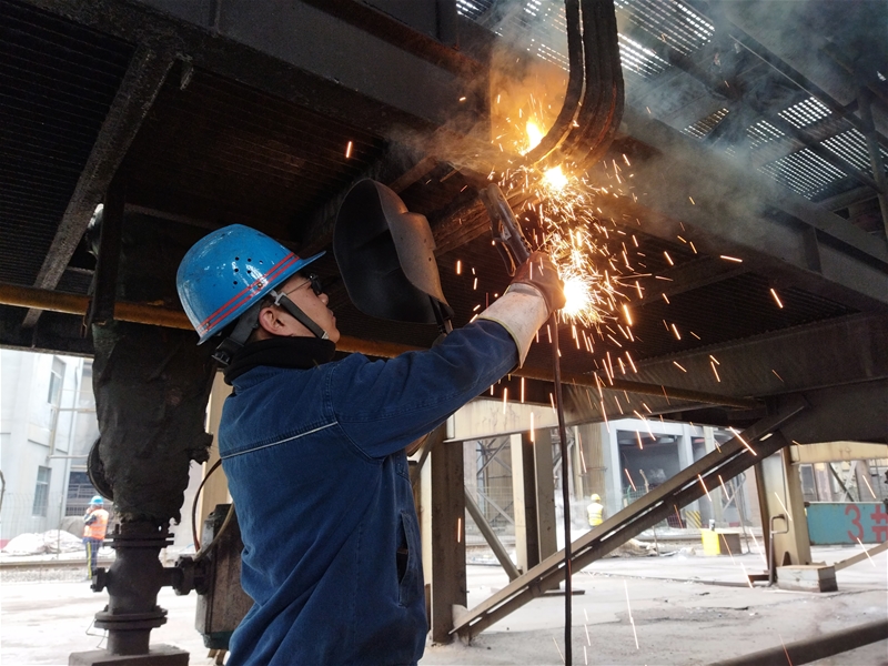 現場焊花飛濺,從拆除廢舊鋼管到焊接新的橋架,3#爐電焊工何澳華作業細致認真,每天6小時不間斷地進行焊接作業,始終專注如一。
