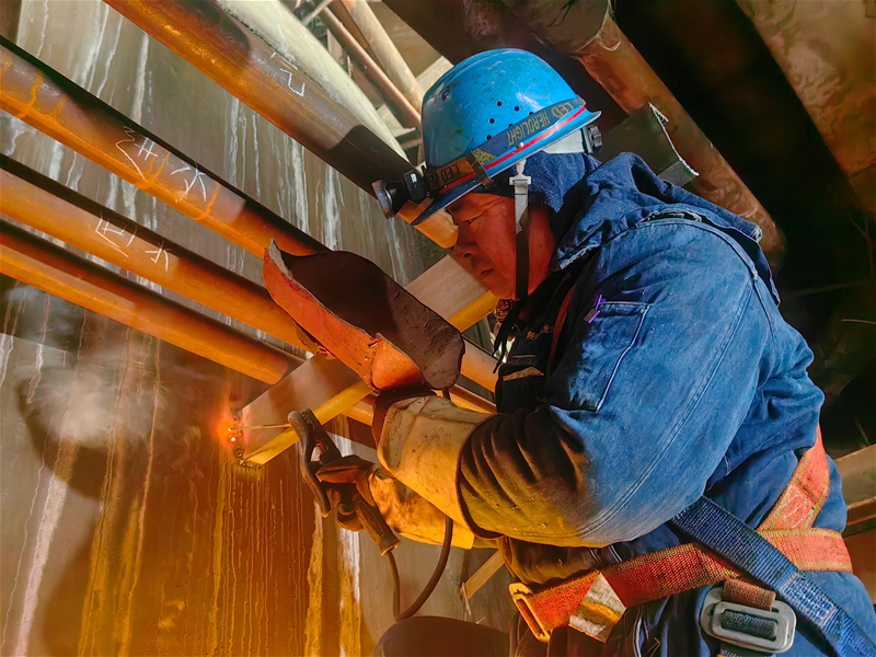 跟隨著張軍喜來到爐頂74米平臺處,只見維修班班長薛聰正全神貫注地修整管道切口,確保嚴絲合縫。爐頂的寒風從領口、袖口鉆進身體里,讓人禁不住打顫……“時間緊、任務重,我得抓緊時間!”薛聰堅毅的目光緊盯氣割槍頭處……