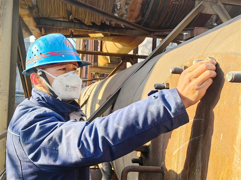 “滴噠噠,滴噠噠……”風鎬的陣陣沖擊聲從渣處理熱水池傳來。站在6米深的熱水池邊,渣處理主操鬲敏學正手持風鎬,瞄準那塊最高最硬的黏結積渣,屏息凝氣,三下五除二將堅硬的積渣擊碎。