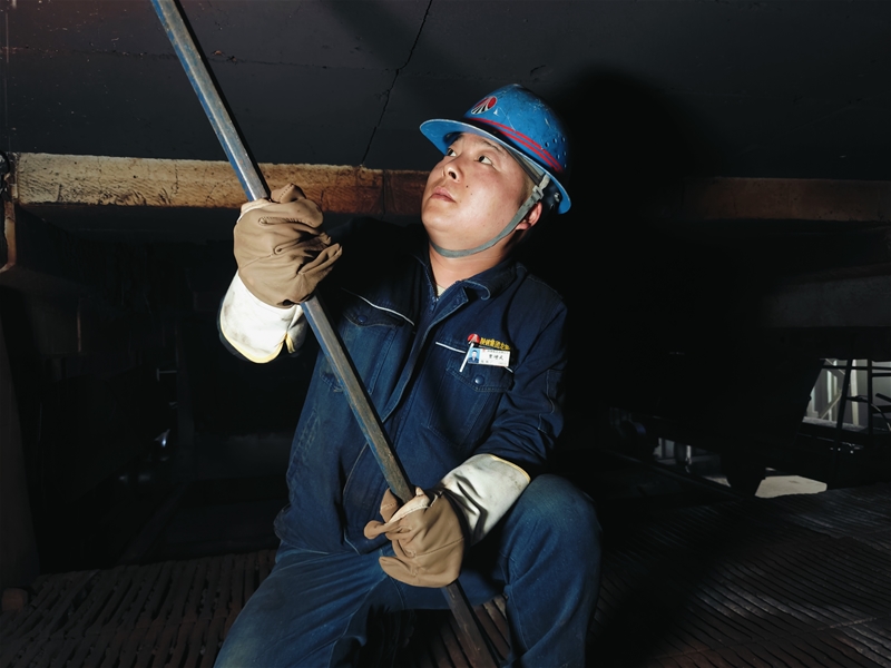 還未完全冷卻的爐膛就像一個(gè)大烤爐。賈增武佩戴好煤氣報(bào)警器,對(duì)爐內(nèi)煤氣濃度進(jìn)行檢測(cè)達(dá)標(biāo)后,拿起制作好的工具,直接進(jìn)入爐膛內(nèi),找準(zhǔn)位置,上下發(fā)力,頑固的結(jié)瘤一塊塊被敲落下來。同樣的動(dòng)作,在不停地反復(fù)進(jìn)行著,看似簡(jiǎn)單,其實(shí)要消耗大量體力。不一會(huì)兒,豆瓣大的汗水順著他的臉頰滴落在尚有余溫的臺(tái)車上被瞬間蒸發(fā)……面對(duì)高溫他們迎難而上、緊密協(xié)作,最終提前兩個(gè)小時(shí)完成燒嘴清理工作。