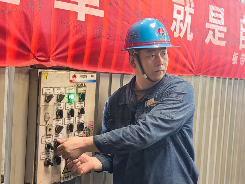 上午8:10,激烈而緊張的換輥“競賽”正式開始,只見“參賽者”的身影穿梭在現場,仿佛4×100游泳接力賽場上你追我趕的運動員。軋鋼工緊密協作,動作嫻熟,每一個步驟都精準無誤。王煜和范宇坤負責拆卸舊輥,并配合天車工將需要更換的軋輥慢慢從軋機中抽出來,放置在下線軋輥指定地點。李陽和楊延博配合默契,負責吊運新輥以及安裝調試工作,只見一人負責操作箱操作,一人根據其指示小心翼翼地操作按鈕,調試后再仔細檢查,確保導衛和除塵水管完好無損。精軋班長蓋俊生則負責檢查換輥質量,整個過程每一個人都恪盡職守、全力以赴,每一個環節都如同接力賽中的一棒,傳遞著責任與使命。
