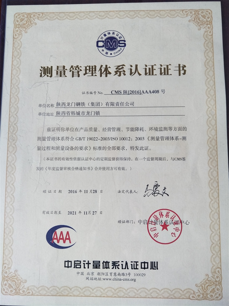 龍鋼公司于2002年初建立了計量檢測體系,2007年依據ISO10012-2003標準進一步修改和完善公司計量檢測體系,增加了測量過程控制要求,建立了測量管理體系,并于2007年12月首次通過中啟計量認證的現場審核,取得“AAA”級測量管理體系認證證書。累年來,通過測量管理體系的有效運行和監督審核工作的認真開展實施,公司測量管理體系得到了不斷改進和完善,在企業的工藝監測、質量控制、成本管理、環境監測方面發揮著不可替代的計量保證作用。