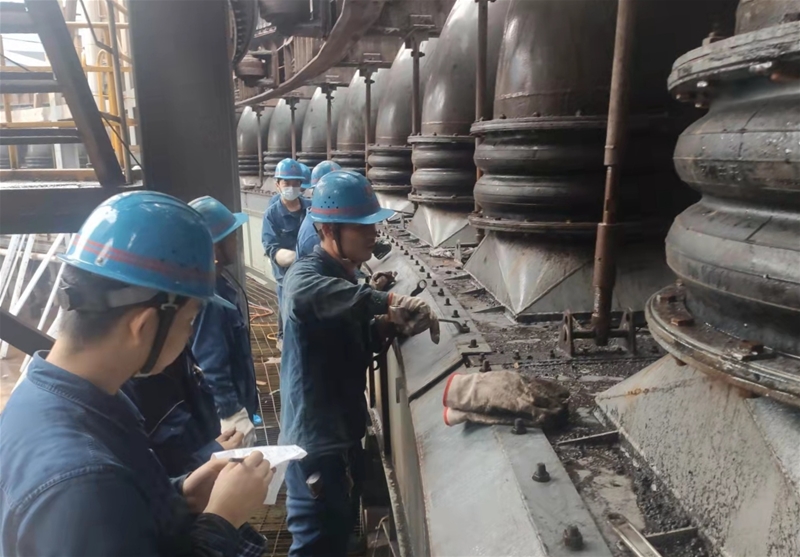 圖二:高爐崗位職工在對(duì)爐頂?shù)臍饷芟洹x表儀器等關(guān)鍵生產(chǎn)設(shè)備進(jìn)行檢查,做好精密儀器的防潮、防雨工作,確保生產(chǎn)系統(tǒng)穩(wěn)定順行。