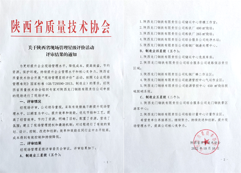 龍鋼公司深入推進現場管理星級達標工作,認真策劃部署,常態化開展6S考評、六個一、對標交流、“六個百分之百”活動,按照“零容忍、無死角、全覆蓋”要求,圍繞環保攻堅過程、生產實際和文明施工中存在問題,相互對標、系統治理,持續鞏固,實現現場管理共同提升。模擬開展林業碳匯造林項目,傳播綠色低碳生態理念,將產業結構與生態經濟相結合,大力開展植樹造林,增加綠地面積,提高綠化覆蓋率,落實綠化專業管護,加強綠化養護精細管理,保障苗木茁壯生長,提升綠化效果。2022年,經陜西省質量技術協會現場星級評價,龍鋼榮獲省級星級現場12個(五星級2個,四星級5個,三星級5個),成為陜西省榮獲星級現場最多的企業,并榮獲“省級園林式單位”稱號。