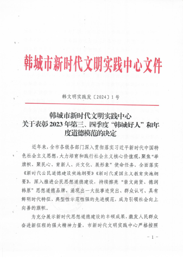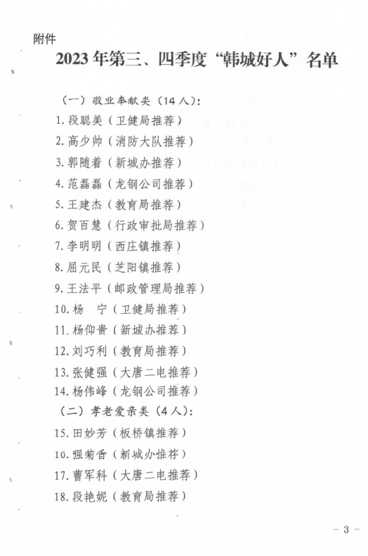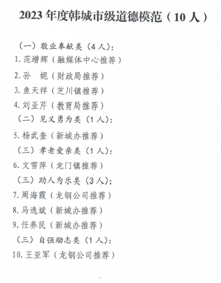 近日,韓城市2023年第三、四季度“韓城好人”和年度道德模范名單出爐。公司6名職工“榜上有名”。其中范磊磊、楊偉峰榮獲敬業奉獻類“韓城好人”,巨輝、路鵬榮獲見義勇為類“韓城好人”,周海霞榮獲助人為樂類“道德模范”,王亞軍榮獲自強勵志類“道德模范”。