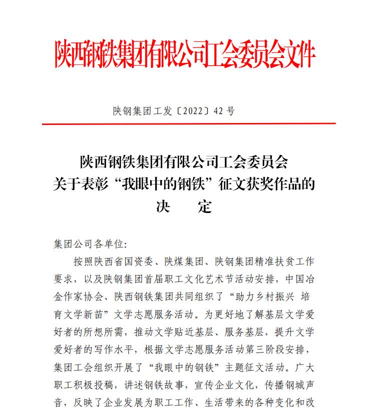 近日,從陜鋼集團(tuán)工會(huì)《關(guān)于表彰“我眼中的鋼鐵”主題征文獲獎(jiǎng)作品的決定》文件獲悉,龍鋼公司6篇征文獲獎(jiǎng)。