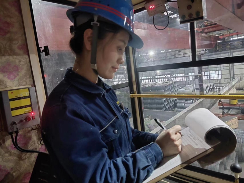 2019年9月,作為新入職大學生的她加入軋鋼廠天車工這個大家庭。身為學徒,在看到師傅第一時間處理軋線飛鋼的從容時,她便在心里默默立下目標:“我要抓緊時間努力練習,爭取早日出師,做獨當一面的員工。”于是,在后來的學習中,她盡可能地抓住每一次可以練習穩鉤、開車的機會,買飯的路上風馳電掣,打掃衛生馬不解鞍。為減少如廁次數,她盡量少喝水,有時甚至幾個小時都不喝水。在崗的時間被她合理安排,下班之后她仍然堅持學習,穩扎穩打的基本功在她的爭分奪秒中迅速得到提升。帶著進廠時的初心,她成為同一批學徒中最早出師的女天車工。