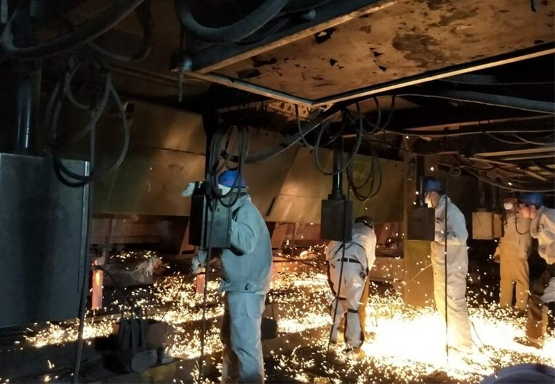 最后一站是攝影記者們向往已久的煉鋼。走進煉鋼新區,“打造中國最具競爭力的高端鋼鐵材料服務商,建成美麗幸福新陜鋼”的巨幅宣傳牌不禁讓人精神一振。當走過爐前的“文化長廊”后,加廢鋼的斗子懸在轉爐上空,操作室內,爐長張社寧仔細地觀察著各個下料成分、重量的數字變化,看到我們來熱情地打招呼。來到連鑄機平臺,一名爐前工喊著“讓一下,小心燙”,一邊用厚厚的白手套挑著鋼釬,經詢問原來是剛換下來的中包結晶器套管。中包工們一字排開站立在中包各流口前,操作著中包拉鋼設備,看著火紅的鋼水聽話地流進結晶器口,前邊是鋼水的炙烤,后邊吹風機呼呼地吹著,鐵打的人也會因為8小時的長時間站立而困乏顫抖,他們的毅力難以想象。“爐內煉鋼,爐外練人”的傳說真是再現了這種情景。