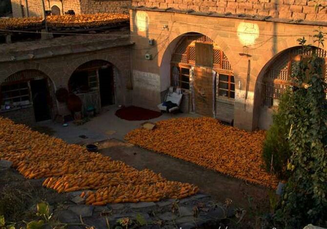 冬日的陜北,山脈連綿寂寥,可裊裊炊煙卻為這廣闊天地添了幾分色彩。天還麻麻亮的時候,陜北的婆姨就開始忙了,堿坂上的碾轱轆悠哉悠哉的轉著。拉碾子的驢走走停停,時而偷吃一嘴玉米面,婆姨罵罵咧咧道:“你這個老家禽,給你喂時你不餡,正讓你干活你就餡歡了,噔俅。”跟著母親的孩子,懷中抱著柴草,燃燒在磨盤旁邊,給母親足夠的亮光。“日上三竿”,人們才懶洋洋的出了窯洞,太陽暖烘烘的照到堿坂上那幾根椽上時,那里就開始熱鬧了。吃過飯的人們來到這里,圪蹴在椽上曬太陽,偶爾有一兩家飯做得遲的,會端上美美一老碗黃米撈飯,來趕個場,也圪蹴下問旁邊的人:“你們吃蘭嚒?沒吃家里多得是,可道我家舀去。”眾人發出:“你就不會把盆端出來?小氣死啦、光顧你一個人吃哩、端一碗夠誰吃?你也太不實在了……”端飯的人嘿嘿一笑,嘶溜嘶溜的吃起自己的飯。