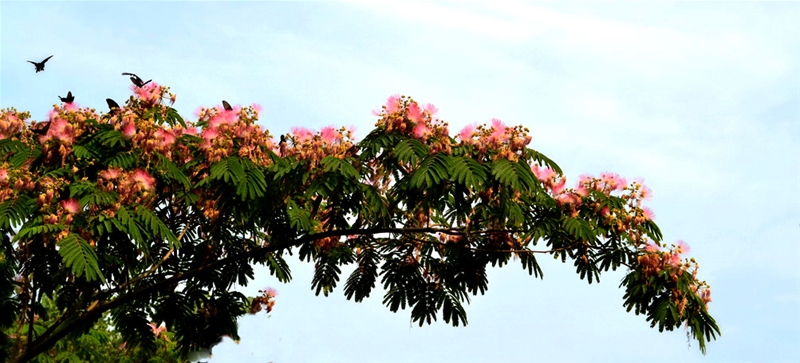 我從沒見過這種樹,如羽毛一般的葉片和粉色的團花真是漂亮極了。姥姥告訴我說,這是絨線樹,花能入藥、泡茶,每年從六月開始開花,能開到七月底,已長了十來年了。小小的我,站在樹下,覺的這樹特別高大,那如巨傘一般的樹冠給我們帶來了很大一片蔭涼,尤其是每到夏天,那一頭粉色的絨線花,溢彩流霞、迷蒙飄渺,真是美極了。還有那獨特的、清香的味道能飄出很遠,清爽的、甜美的,吸一口,不由的會使人瞇起眼睛。