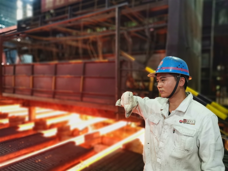 走近6#連鑄平臺,瞬間宛如桑拿房,雖然旁邊有幾臺大型軸流風機在不停地旋轉,但是車間內依然是熱浪灼人,令人喘不過氣來。聽到“嗒嗒嗒”的聲音,天車正忙碌地調運鋼水,大包工正吹著口哨,提醒現場人員注意安全。他一邊擦拭汗水,一邊用對講機指揮作業(yè),熟練地引導天車座包。中包工們正頂著五六十度的高溫,在連鑄機旁進行澆鋼、測溫等作業(yè)。連鑄輥道,切割工們有的在切割鋼坯,有的在處理尾坯。為確保安全,他們穿著厚厚的工作服,里面還穿著秋衣秋褲,佩戴安全帽、防護鏡、厚手套,穿著勞保鞋。這樣嚴實的一身裝備,一般人就是站一會都難以忍受,而他們卻全然不顧炙熱鋼坯的灼烤,各項工作仍有條不紊地進行著。一爐爐火紅的鋼水在他們的精心澆鑄下,成為一塊塊優(yōu)質的連鑄鋼坯。