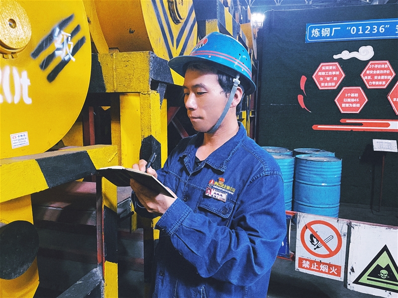 在火熱的連鑄生產現場,班長陳超所在的維修班嚴格執行高溫天氣點巡檢制度,確保設備維護到位,聯鎖保護到位。悶熱炙烤的廠房里已是一片火熱,他們穿梭于臺上臺下,身上的藍色工服早已浸滿汗水。