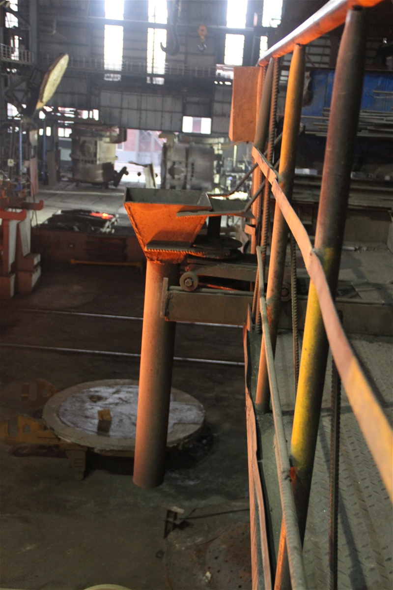 本發(fā)明提出一種新式的灌砂裝置,它可以滿足大包全程加蓋后的灌砂作業(yè),具有操作簡單、維護量少、無故障率、定位準確,通過在鋼包出鋼前運行線路上方制作一個軌道、移動小車及旋轉軸,小車上焊接一個專用灌砂斗和¢150mm的鋼管,鋼管垂直對準水口,當鋼包運行到區(qū)域范圍內,人推小車在軌道上帶動灌砂斗調整縱向灌砂位置,縱向到位后,旋轉灌砂斗微調橫向位置,達到準確對中后,進行灌砂作業(yè)。