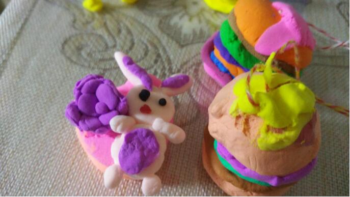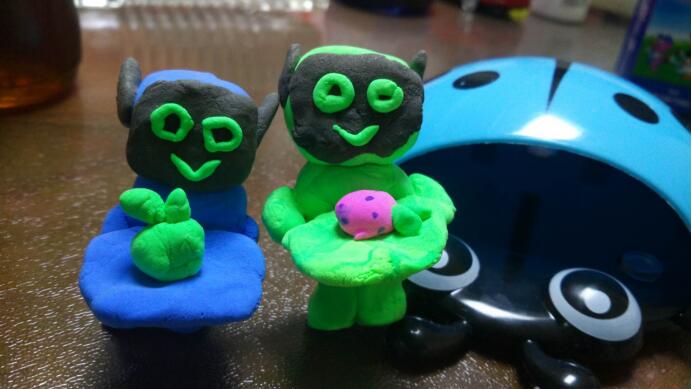 妮子的手很巧,一盒橡皮泥在她的手里像施了魔法似的千變萬化,想要什么就捏什么:有七彩虹,有美味的心形蛋糕,有漂亮的蝴蝶仙子,有吃著胡蘿卜的兔子,有躺在嬰兒車里的小嬰兒,有套在手指上的大花指環,有掛在脖子上的漂亮吊墜,有小茶壺和小茶杯。旸程喜歡機器人,她就在手機上看了一眼,不一會功夫就捏出來了:藍色的身子,方形的頭,圓圓的眼睛,尖尖的耳朵,手里還托著個盤子,是專門送水或者送別的東西用的,竟和手機上的機器人相差無幾。旸程直夸“真不錯,真像,姐姐真棒!”再一會功夫,妮子又捏出了另一個機器人,倆人學機器人走路,學機器人對話,玩得不亦樂乎。