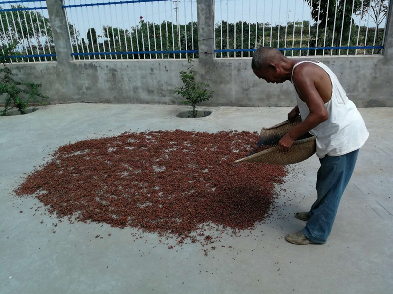 中午吃飯的時候,爺爺就不見了,只聽見院子里“嚓嚓嚓”的聲音,隨即我來到院子里看見爺爺在收花椒,摸了摸花椒還沒干就問爺爺:“爺爺,花椒還沒曬干怎么就收了。”爺爺說道:“這曬花椒不能曬的太干了,太干了花椒就碎了,不好脫籽”說著爺爺已經將花椒掃成一堆,用木扒將花椒輕輕地拍打,使花椒籽從花椒上脫離出來,隨后將大部分花椒用木扒扒出來晾曬,剩下的花椒和籽混在一起不好分離,這時候爺爺就用簸箕將花椒和籽用他的多年技術給分離出來。看著爺爺干的好不熱鬧我也試著干了一會,發現花椒粒沒有從花椒籽里分出來,它們還是混在一起,看來這個活還得慢慢積累經驗。